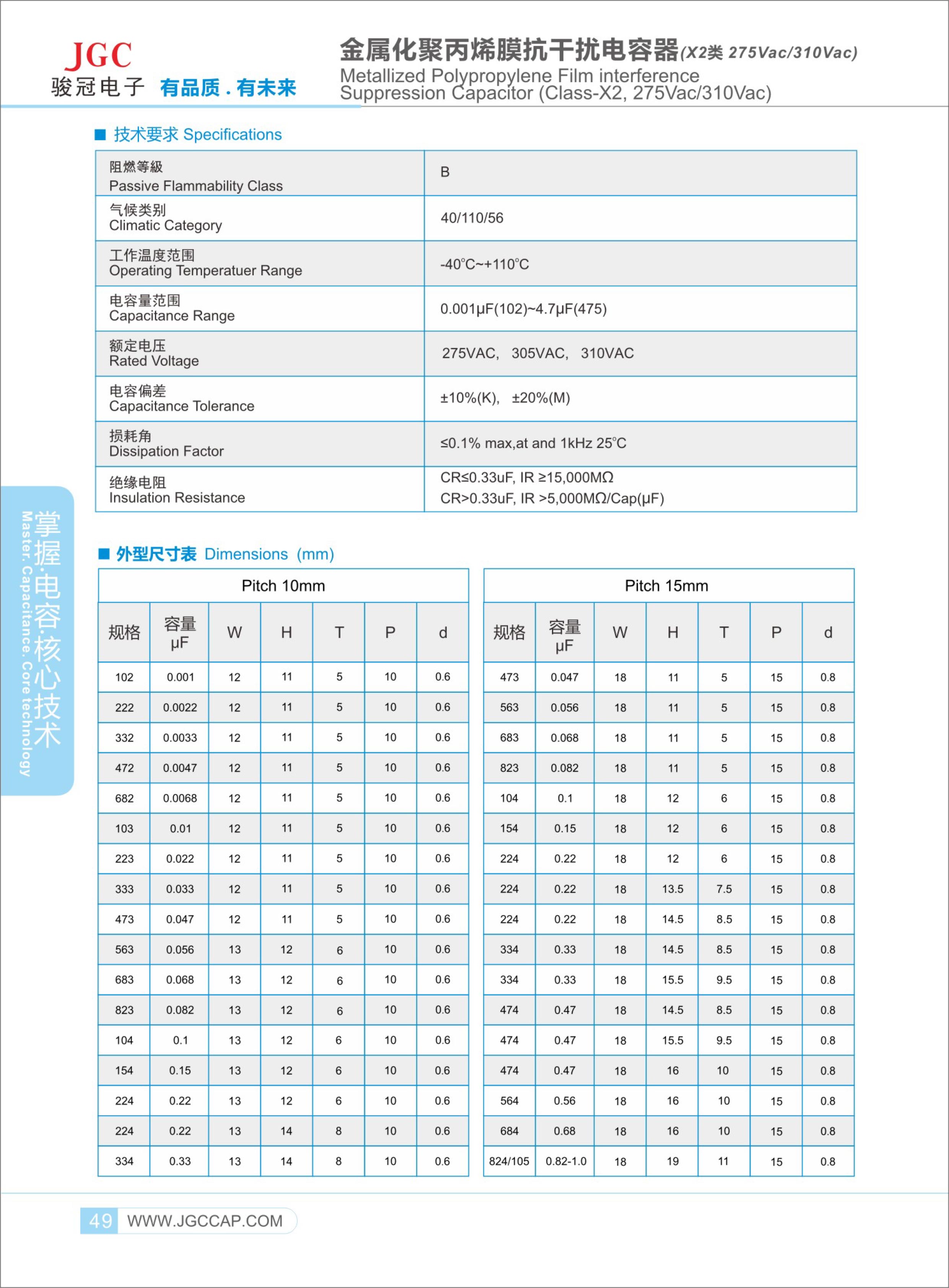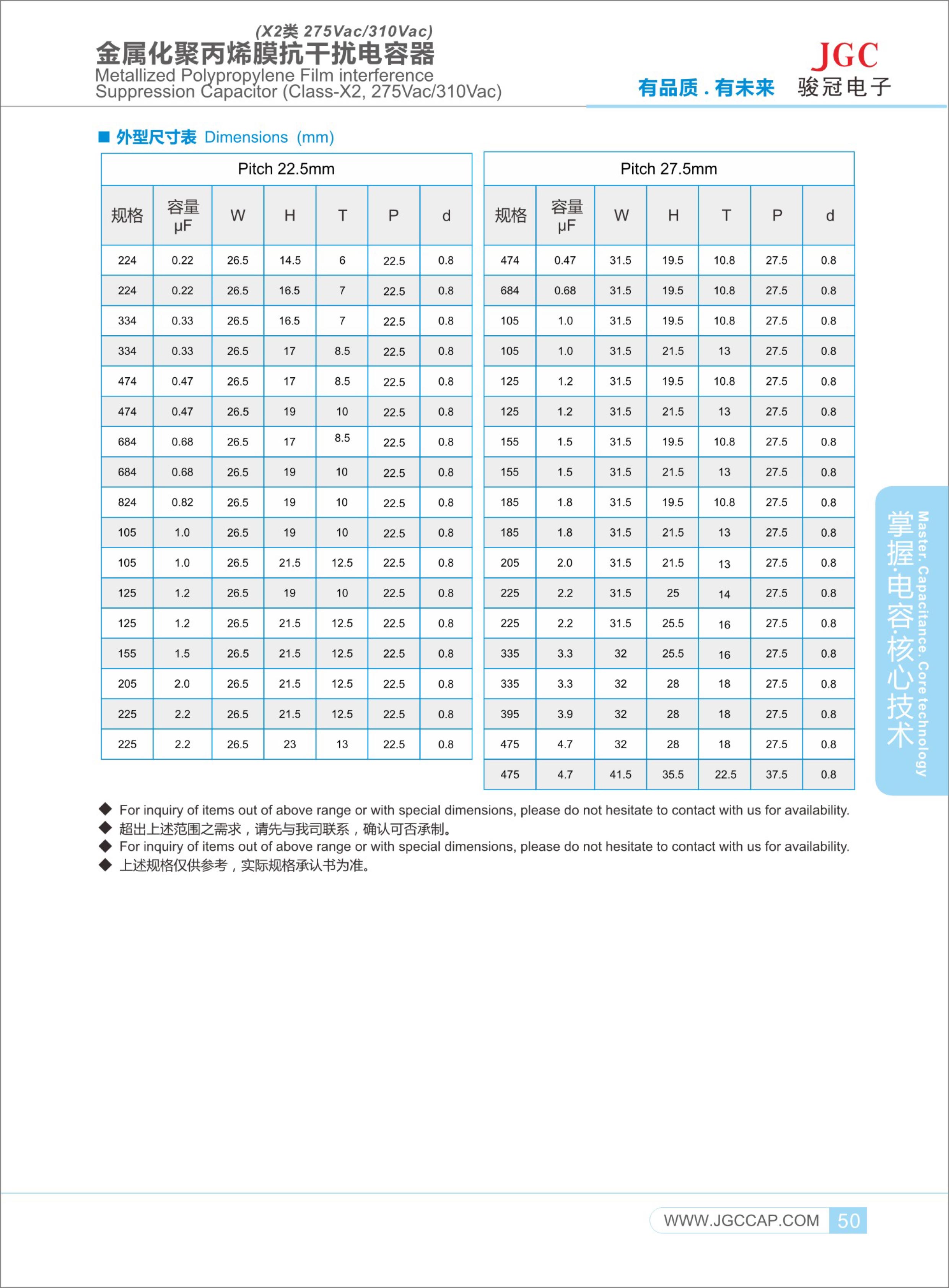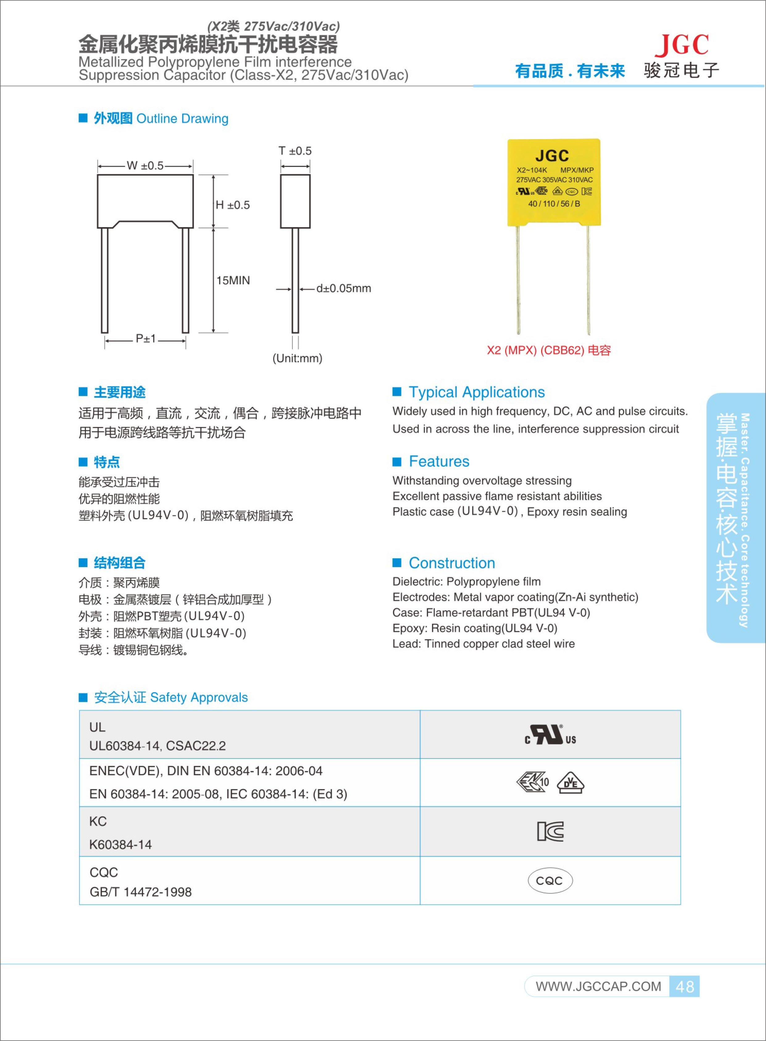 標(biāo)準(zhǔn)系列X2電容器產(chǎn)品,多國(guó)安規(guī)認(rèn)證,X2電容器的容量可高達(dá)10uF,采用高分子聚丙烯薄膜介質(zhì)、加厚型金屬化電極、全自動(dòng)噴焊工藝、94V0級(jí)阻燃PBT塑殼、環(huán)氧樹(shù)脂密封,